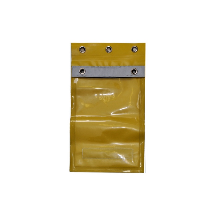DESCRIPTION: Constructed from heavy duty PVC this strong and durable Document Holder is ideal for storing Permits and Isolation Documents. Includes a velcro top to ensure that water, dirt and grime are kept out and eyelets for hanging on machinery. Velcro top and a loop and hook fastener closure ensures water, dirt and grime is kept out. Yellow with reflective tape on front of Permit Holder ensures day/night visibility. Clear PVC window for displaying/storing permits, lockout procedures and SDS (Safety Data Sheets). Apply Safety Padlock to lock permit or keys inside.