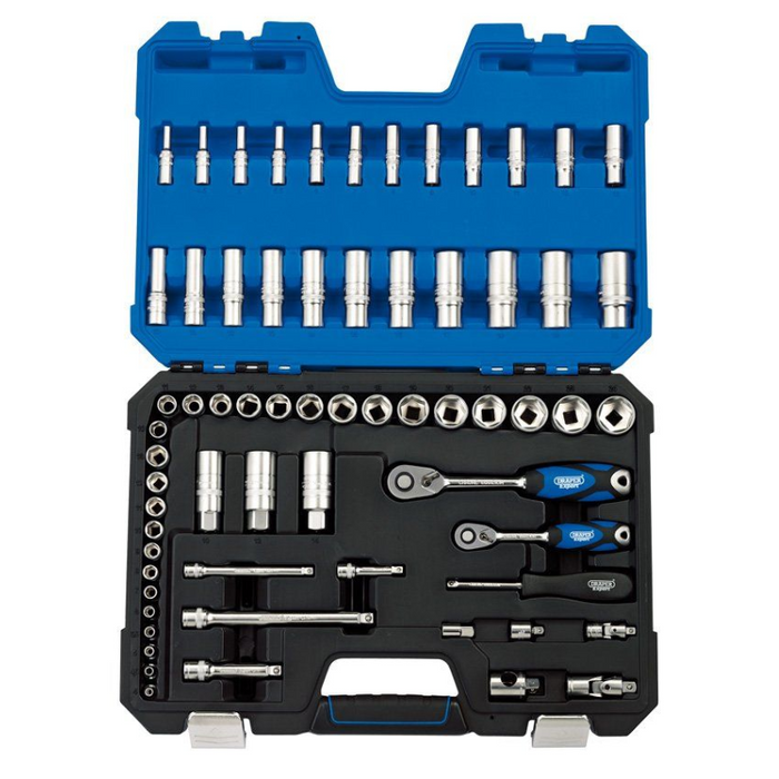 DESCRIPTION: Draper Tools 1/4 and 3/8 Sq. Dr. Metric Socket Set (65 piece) CONTENTS: 1/4 SQUARE DRIVE: 12 sockets size 4, 4.5, 5, 5.5, 6, 7, 8, 9, 10, 11, 12, 13mm + 12 deep sockets size 4, 4.5, 5, 5.5, 6, 7, 8, 9, 10, 11, 12, 13mm + 72 tooth reversible ratchet with soft grip handle and quick release button + spinner handle + 2 wobble extension bars 50, 100mm + 1/4 (F) x 3/8 (M) adaptor + universal joint 3/8 SQUARE DRIVE:15 sockets size 10, 11, 12, 13, 14, 15, 16, 17, 18, 19, 20, 21, 22, 23, 24mm + 11 deep sockets size 10, 11, 12, 13, 14, 15, 16, 17, 18, 19, 22mm + 3 spark plug sockets size 10, 12, 14mm + 72 tooth reversible ratchet with soft grip handle and quick release button + 2 wobble extension bars 75, 150mm + *T bar adaptor 1/2 (F) x 3/8 (M) + 3/8 (M) - 1/4 adaptor + universal joint. *T bar head/converter when used with extension bar forms a sliding T bar FEATURES: six point sockets made from chrome vanadium steel that’s hardened and tempered with a micro satin finish. Each socket has a knurled ring for extra grip. Supplied with a 72 tooth reversible soft grip ratchet and accessories. Packed in a tough plastic storage case with soft grip handle. Standards: Manufactured and tested generally in accordance with DIN3122 and ISO3315 Specifications