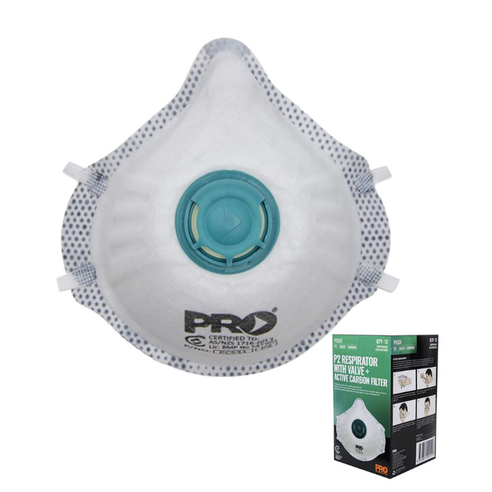 DESCRIPTION: Dust Masks P2+Valve+Carbon Pack 12 FEATURES: Suitable for use with dust, smoke, mist & fume. | Activated carbon layer reduces exposure to nuisance levels of organic vapor and odour. | Lightweight moulded design with foam nose seal for comfort and superior fit. | ProValve for increased exhalation efficiency and comfort, reduces heat build-up under mask. | Easily worn with glasses & goggles. | P2 Certified to AS/NZS 1716:2012 Respiratory Protective Devices. | Dual latex free elastic straps for ease of donning & doffing. | Resealable bag for hygienic storage. | Qty/Box - 12