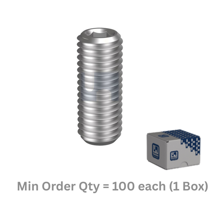 SOCKET GRUB SCREW HEX CUP PNT | Specification: DIN 916 / A2 | 304 STAINLESS | Thread: M5-0.80 x Fully Threaded - 20mm long | Hex size: 2.5mm | Min Order Qty = 1 Box (100 each)