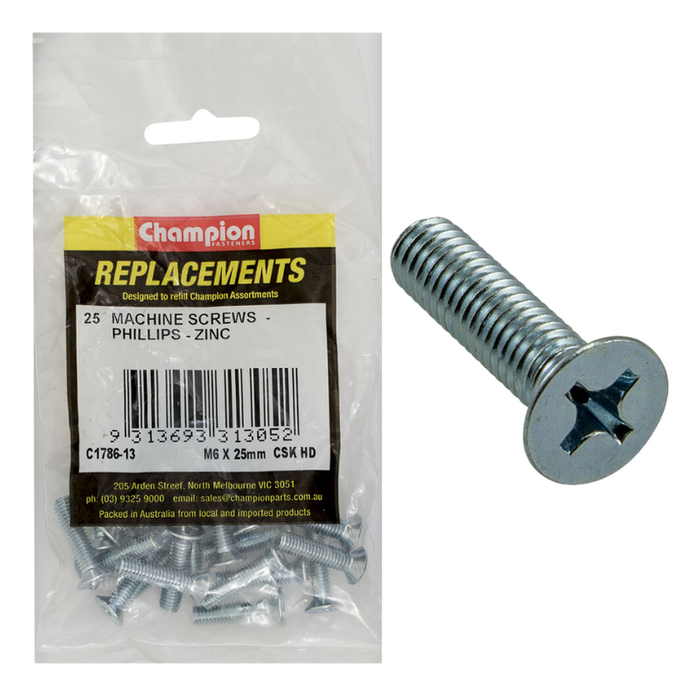 Champion CSK Phil Screws M6 x 25mm Zinc Pkt = 25