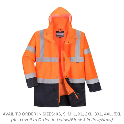 DESCRIPTION: S766 Essential 5-in-1 Two-Tone Jacket - Orange/Navy AVAIL TO ORDER IN SIZES: XS, S, M, L, XL, 2XL, 3XL, 4XL, 5XL [ Also avail to Order in Yellow/Black & Yellow/Navy FEATURES: Shell Fabric: 100% Polyester, 300D Oxford Weave with a Stain Resistant finish, Double PU Coated 190g | Lining Fabric: 100% Polyester Mesh 60g | Additional Lining Fabric Info: Outer Jacket: 100% Polyester Mesh 60g | Inner Jacket: 100% Polyester Fleece 280g | Removeable Lining : 100% Polyester Fleece 280g SPECIFICATIONS: Waterproof with taped seams to prevent water penetration