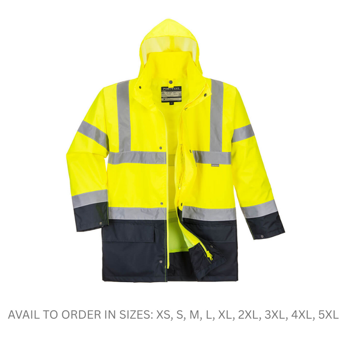 DESCRIPTION: S766 Essential 5-in-1 Two-Tone Jacket - Yellow/Black AVAIL TO ORDER IN SIZES: XS, S, M, L, XL, 2XL, 3XL, 4XL, 5XL [ Also avail to Order in Yellow/Navy & Orange/Navy FEATURES: Shell Fabric: 100% Polyester, 300D Oxford Weave with a Stain Resistant finish, Double PU Coated 190g | Lining Fabric: 100% Polyester Mesh 60g | Additional Lining Fabric Info: Outer Jacket: 100% Polyester Mesh 60g | Inner Jacket: 100% Polyester Fleece 280g | Removeable Lining : 100% Polyester Fleece 280g SPECIFICATIONS: Waterproof with taped seams to prevent water penetration