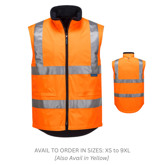 DESCRIPTION: MV214 - Hi-Vis Reversible Vest - Orange [AVAIL TO ORDER in sizes: XS,S,M,L,XL,XXL, XXXL,4XL,5XL,7XL,9XL] FEATURES: Hi-Vis Polar Fleece fully reversible vest with Heat seam sealed Oxford waterproof shell. Tough plastic zipper closure and Velcro Closures on embroidery pockets. Reflective tape around body and over shoulders (not on navy side). Makes a 4-in-1 set when zipped into any Shell Jacket. 4 pockets for ample storage | Interactive zip for added functionality | Reversible garment for multi use | Fleece lining for added warmth and comfort | Dipped back hem for better coverage | Two lower pockets | Reflective tape for increased visibility | Waterproof and breathable with taped seams to prevent water penetration | Wind resistant fabric to protect against wind chill | Shell Fabric : 150D: 100% Polyester, 150D Oxford weave, PU coated 130g | Lining Fabric : 100% Polyester Polar Fleece 180g [Also Avail In Yellow SAFMV214YER]