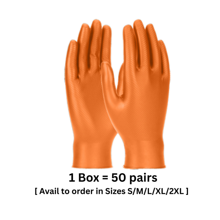 DESCRIPTION: GRIPPAZ™ Skins Extended Use Gloves - Orange - XL| Box of 50 [Avail to in Orange SAFGNSODN or Black SAFGNSBDN] FEATURES: Grippaz™ Skins patented design on the inside and outside of the glove provides extra traction with oily or wet parts. | 6 mil heavy duty proprietary nitrile blend with patented fish scale pattern is more tear-resistant and puncture-resistant than conventional single-use disposable gloves – for prolonged use and reduced waste. HACCP approved for food handling and manufacturing. | ESD safe, surface resistance per ASTM D257, static dissipative range at 10^8 ohms, 12% RH, 48hrs @ 100 Volts. Physical Dimensions: SIZE S M L XL PALM WIDTH 8.5CM +/9.5CM +/10.5CM +/GLOVE LENGTH 24.0CM +/- 24.0CM +/- 24.0CM +/- 11.5CM +/2XL | Resistant to many chemicals commonly used in industrial and OEM applications including oils, grease and cleaning solvents. | Proprietary nitrile blend with beaded cuff offers enhanced flexibility, comfort and mobility – reducing hand fatigue. | Touchscreen compatible to allow the user to operate device without removing gloves.| Carton Buy = 10 Boxes SIZES AVAIL TO ORDER include S, M, L, XL, 2XL
