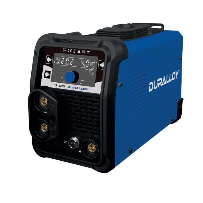DESCRIPTION: Duralloy 121 GASLESS MIG - 10 Amp Gasless MIG/TIG/Stick - Inverter Welding Machine FEATURES: Gasless MIG operation | DC Lift TIG with optional TIG torch | Hot Start & Arc Force for MMA mode | Easy to set up and operate | Suits 1kg spools | Voltage Reduction Device (VRD) | 2 roll wire feeder | Industrial cable connectors (10-25) | IP21S rating | Weight 4kg | Suitable for Mild Steel PACKAGE INCLUDES: Power Source | 2.1M MB14 Style MIG Torch | 3M Earth Lead | 3M MMA Arc Lead | Duralloy 0.9mm 1kg MIG wire | 0.8-0.9 FC Roller for Gasless Wires | Owner’s Manual