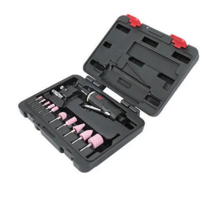 DESCRIPTION: M7 Die Grinder Kit, 15 pce, 20000RPM, 190MM Long, 1/8" & 1/4" Collet FEATURES- 15 Piece Set Includes:. 1pc die grinder (M7-QA111B) | 1pc 1/8" collet. | 1pc 1/4" collet. | 2pcs spanner wrench. | 5pcs 1/8" shank mounted point. | 5pcs 1/4" shank mounted point. | 1pc plug.| Blow Mould Carry Case SPECIFICATIONS: Collet Size: 1/4" & 1/8" | Free Speed: 25000 RPM | Air Requirements: 10 CFM / 90 PSI | Inlet: 1/4" | Overall Length: 155mm | Rated Power:0.3HP | Net Weight: 0.38kg | Sound Pressure: 81.5 dBA | Vibration Level: 1.8m/s²
