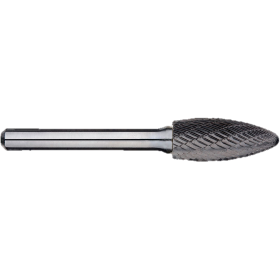 DESCRIPTION: 5/16in Flame Cabide Burr FEATURES: CNC precision-ground flutes for repeatability, chatter-free operation and longer life Sectional fluting enables burrs to cut on the radius as well as the body of the tool 100% inspection of high-temperature brazing to ensure structural integrity Shanks are made from high quality alloy steel hardened to HRC 45-49 to ensure maximum strength and durability