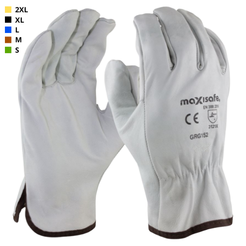 Product Features: Maxisafe Economy Full Grain Rigger Glove Genuine full grain leather, Wing thumb for stitch free palm, Double stitched for strength, Elastic wrist to prevent debris entering, Colour coded cuff for size identification (YELLOW), Manufactured to EN420 standard for accurate sizing and Certified to: EN388:2016 3.1.2.2.X. Applications: General purpose utility work glove, Truck and transport industry, Rigging and Lifting Industry, Timber and forestry, Oil and Gas Industry, Farm and agriculture applications, Mining and construction industries, Building industry and Civil construction. (Sold as each / Available in packs of 12 / 120 pair/carton) Available to order in Sizes: [Small=08] [Medium=09]