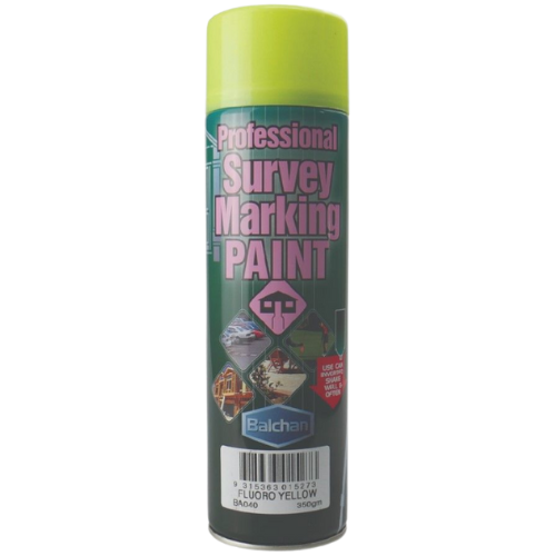 Description: Balchan Professional Survey Marking Paint is a quick drying, long lasting, highly durable spray marker used for writing and spot marking in a variety of applications including: landscaping, construction sites, surveying, school grounds, sporting fields and courts, warehouses, factories, golf courses, parking lots, road surfaces and the backyard. For use on concrete, bitumen, grass, gravel, dirt and timber surfaces.