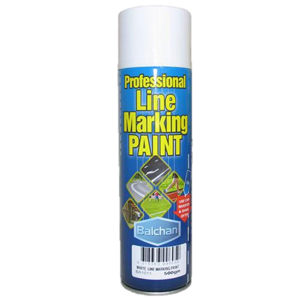DESCRIPTION: Balchan Line Marking Paint is a quick drying, long lasting, highly durable spray marker appropriate for a variety of applications including: Landscaping, Construction sites, Surveying, School Grounds, Sporting Fields and Courts, Warehouses, Factories, Golf Courses, Parking Lots, Road Surfaces and the Backyard. Use on concrete, bitumen, grass, gravel, dirt and timber surfaces. [Available to torder in White, Black, Yellow, Blue][12 cans per carton]