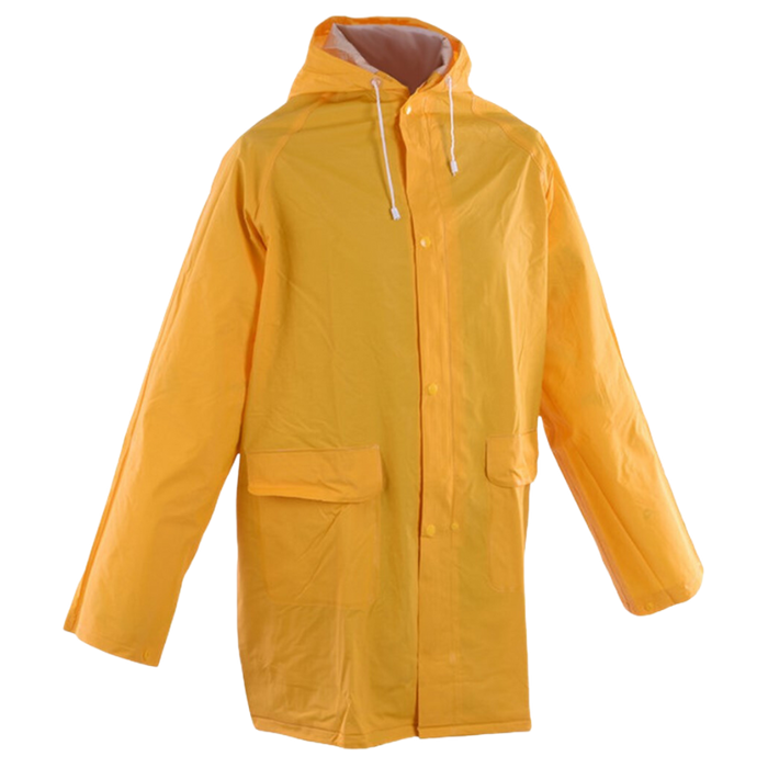 DESCRIPTION: Yellow 3/4 Length PVC Rain Jacket Large Features: 3/4 length PVC/Polyester jacket with elastic cuffs plus studs, Two large pockets, hood with drawstring.