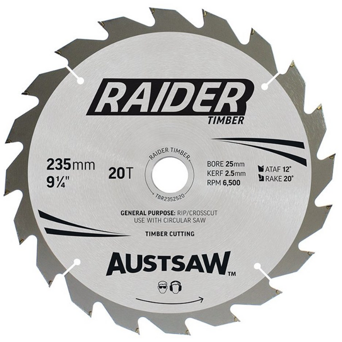 DESCRIPTION: Austsaw Raider Timber Blade 235mm x 25 Bore x 20 T Thin Kerf