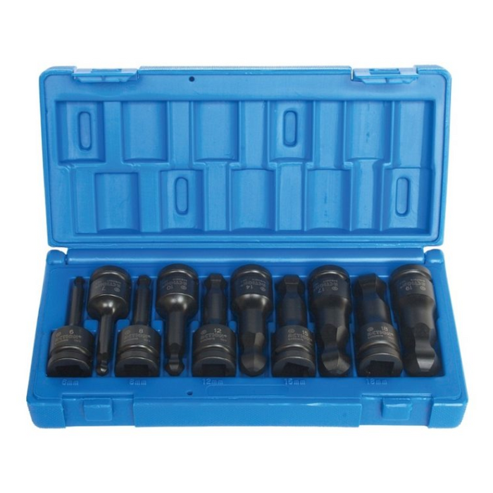 Description: 10 Piece 1/2 Drive Hex Driver, Metric Ball-end, 6, 7, 8, 10, 12, 14, 15, 17, 18, 19, Blow-mold Case.