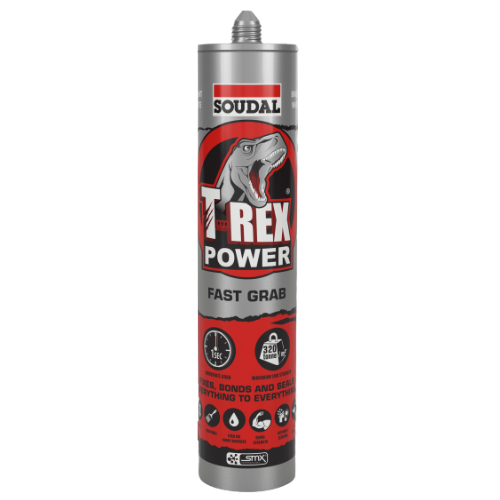 Description: T-Rex Power Fast Grab is a high quality, neutral, elastic, 1-component adhesive sealant based on SMX® Polymer with a very high initial tack. T-Rex Power Fast Grab is a high strength sealant / adhesive that can hold 320kg’s per 10cm2 with a 1 Second immediate grab. Features & Benefits: Fast grab reducing the need for initial support, Fast curing, Good extrudability, High shear strength after full cure (no primer), Stays elastic after curing and very sustainable, No odour, Can be painted with water based systems, Good weather and UV resistance, Does not contain isocyanates and no silicones, Good adhesion on slightly moist substrates, Water potable. Applications: Sealing and bonding in the building and construction industry, Elastic bonding of panels, profiles and other pieces on the most common substrates (wood, MDF, chipboard, etc), Elastic structural bonding in car and container industry.