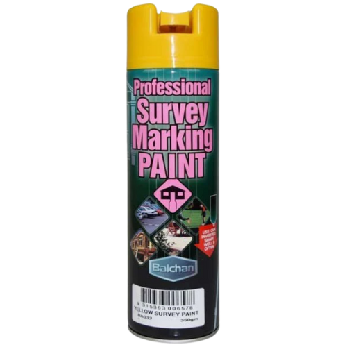 Description: Balchan Professional Survey Marking Paint is a quick drying, long lasting, highly durable spray marker used for writing and spot marking in a variety of applications including: landscaping, construction sites, surveying, school grounds, sporting fields and courts, warehouses, factories, golf courses, parking lots, road surfaces and the backyard. For use on concrete, bitumen, grass, gravel, dirt and timber surfaces.