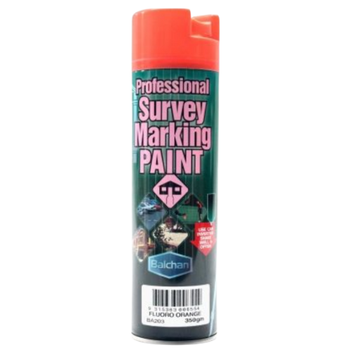 Description: Balchan Professional Survey Marking Paint is a quick drying, long lasting, highly durable spray marker used for writing and spot marking in a variety of applications including: landscaping, construction sites, surveying, school grounds, sporting fields and courts, warehouses, factories, golf courses, parking lots, road surfaces and the backyard. For use on concrete, bitumen, grass, gravel, dirt and timber surfaces.